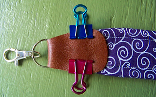 Once the leather and hook part is ready, attach it to the end of the strap (it encompasses about an inch of strap) and use the binder clips to hold it in place. Now switch out your regular needle for a leather one and sew about 1/8th inch around the edge of the leather tabs. I would advise going super slowly, because if you mess up and have to pick out your stitches, you're going to have puncture holes. I mostly just turned the hand wheel and adjusted the tab under the presser foot as I went along.