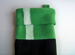Step 7: Now pin the half green/half black front of your stocking to the all green back of your stocking. Sew all the way around except for the top, that's where the candy/presents go.